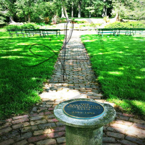 Brick path leading to benches in Shakespeare's Garden, Crapo Park. Crapo Park is located in Burlington, IA.